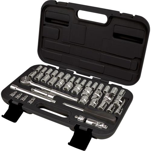 (19) 1/4" Drive standard sockets – 3/16", 7/32", 1/4", 9/32", 5/16", 11/32", 3/8", 7/16", 1/2", 4 mm, 4.5 mm, 5 mm, 6 mm, 7 mm, 8 mm, 9 mm, 10 mm, 11 mm, 12 mm; (16) 3/8" Drive standard sockets – 3/8", 7/16", 1/2", 9/16", 5/8", 11/16", 3/4", 13/16", 10 mm, 11 mm, 12 mm, 13 mm, 14 mm, 15 mm, 17 mm, 19 mm; (1) 3/8" Drive Quick-release ratchet; (1) 3" Long 3/8" drive extension; (1) 6" Long 3/8" drive extension; (1) 3/8" Drive universal joint; (1) 3/8" Female x 1/4" Male drive adapter; (1) 1/4" Plastic handle driver