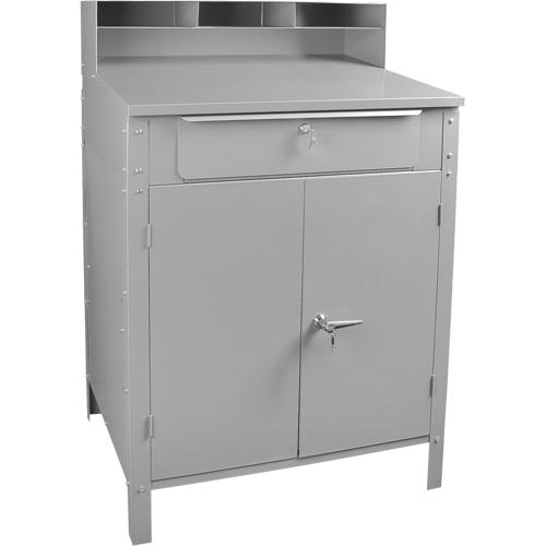 - Same features as the open floor style shop desk, with an added double door locking cabinet